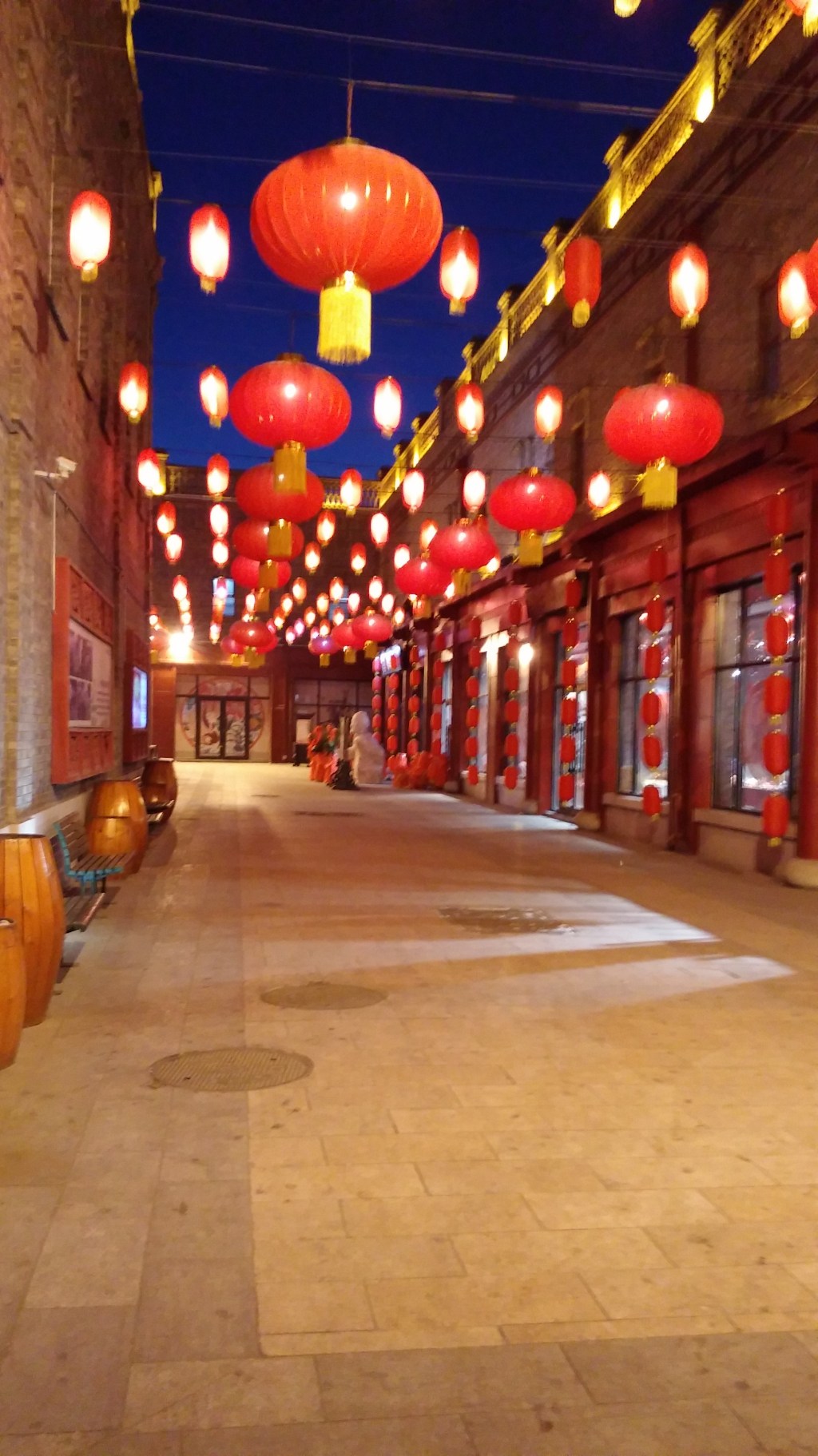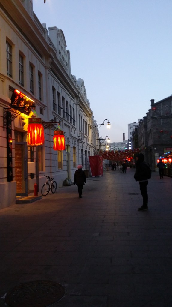 第三個少伏的景點是老道外,這是哈爾濱的老城區,是中國人在俄國殖民時期所居住的地方。這裡的建築都是巴洛克風格,但角角落落都有中國風味,頭頂掛著一排排大紅燈籠,角落裡有民國風的畫。街上時而有幾檔小販,賣冰糖葫蘆、糖畫。百年前這裡是繁華的商店街,現在卻人去樓空。這裡並不多人,店也不是全部都營業,感覺就是室外真實版的關東古巷,更有一股頹廢感。