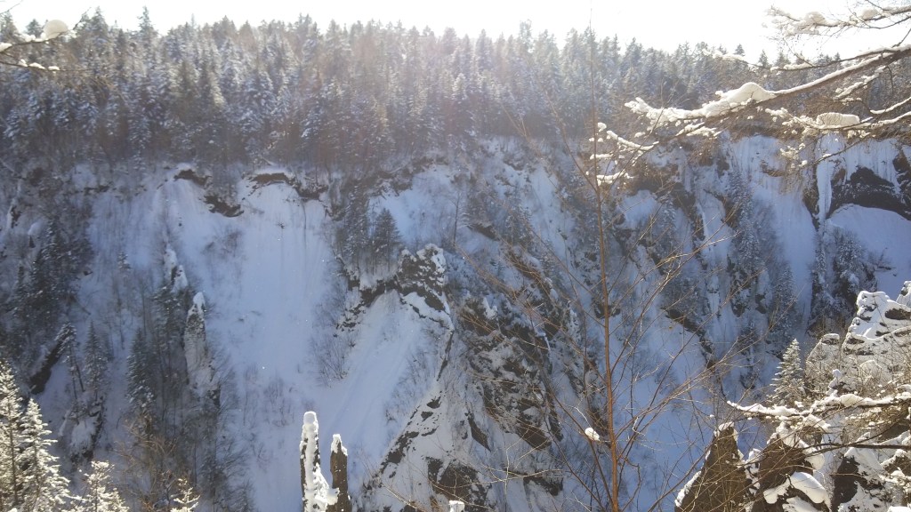 聽說冬天的西坡主要看王池和大峽谷,也要走棧道登主峰看天池,有時天氣不好,連天池也會關掉,聽說前一天就是關了天池。剛好這天沒下雪也較暖和,園區便開放王池。在到天池之前,我們先去看看大峽谷。同樣要坐區內的環保車,下車以後還要走一段路才能到大峽谷,就像要走過昨天的地下森林一樣,穿過一片林子,才到能看到大峽谷的地方。朋友們都覺得這峽谷不是特別壯觀,沒逗留多久就離開了。
