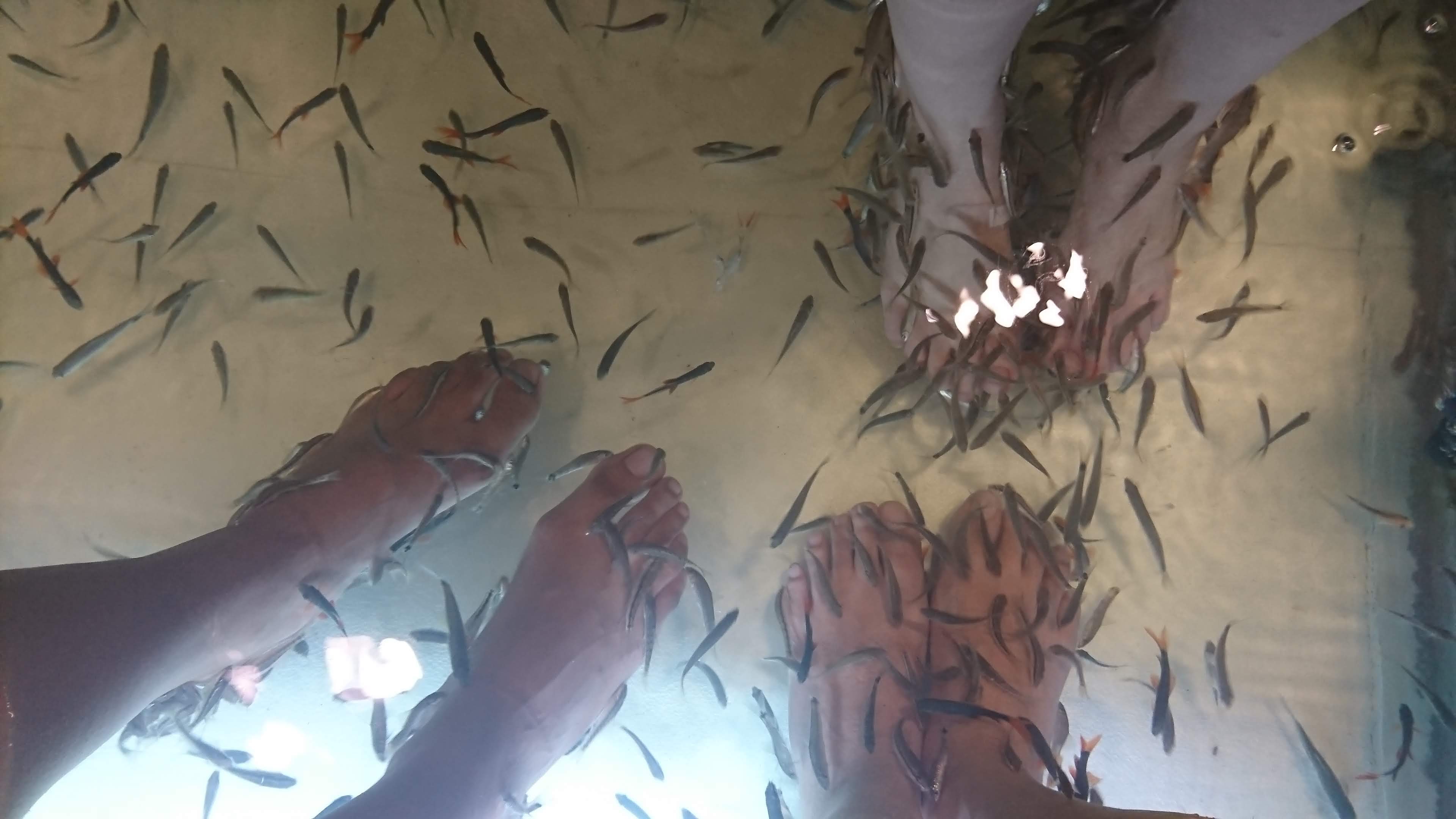 我們坐下來的那個時間點已經是接近打烊,就只有我們幾個客人。雙腳一下水就有成堆成堆的小魚遊過來咬腳上的死皮,一群小魚堆滿在腳上,快要看不見自己的雙腳。一開始還沒適應,感覺極酥癢(本來我也是怕癢的人),實在忍不住要甩開那些瘋狂在我的腳上細咬的餓魚。過了幾分鐘,是適應了,小魚也是吃個半飽,堆在腳上的魚群大小已沒有一開始的誇張,感覺也沒有一開始來的刺激。整個魚療約15分鐘,完結後我們都在摸自己的腳有沒有變滑,總結來說也是個十分有趣的體驗XDDD