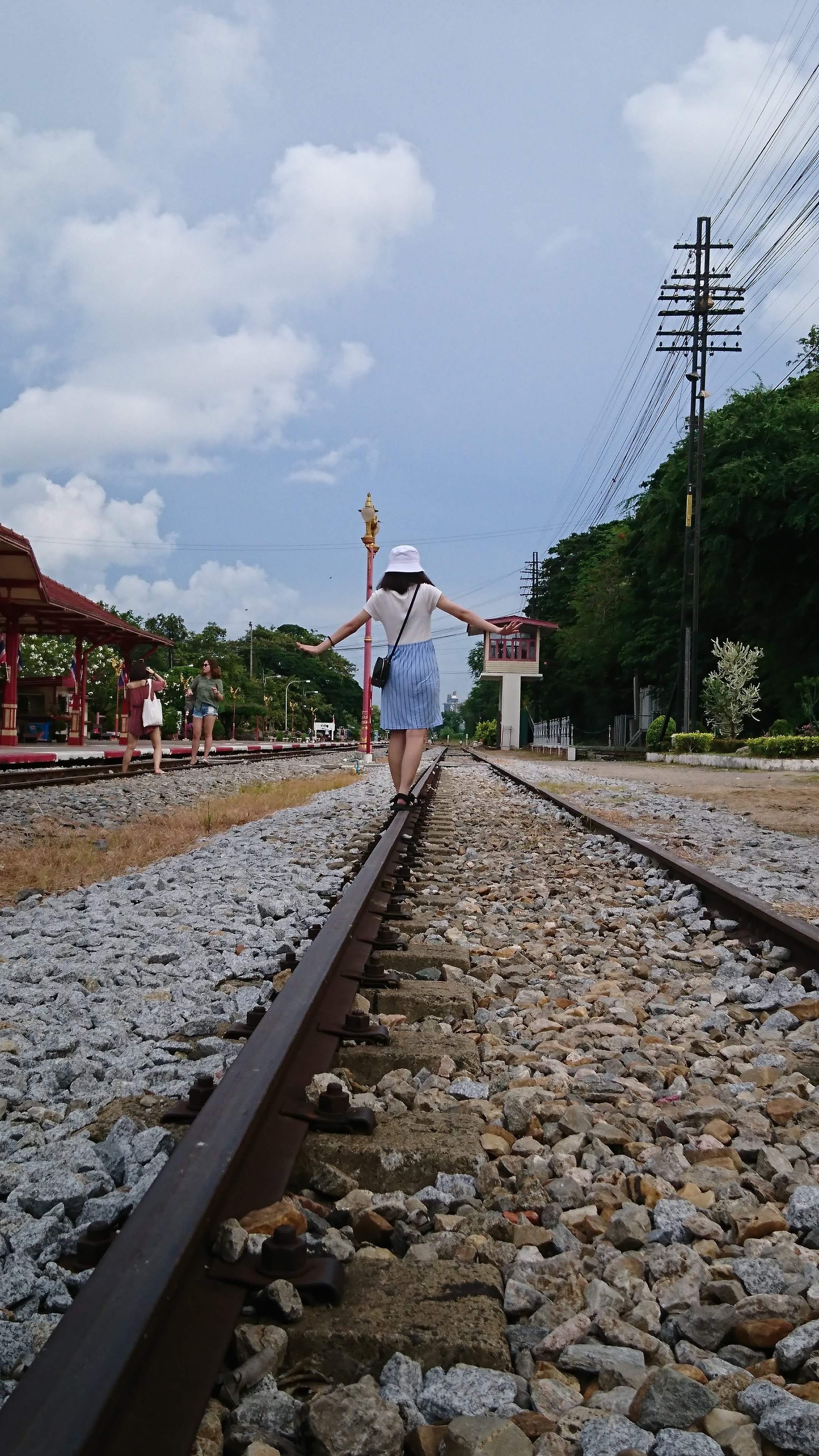 遊客不用購買車票亦可走進月台,甚至是走到路軌上拍照。繁星般多的灰黃色小石佈滿一地,褐色的路軌延伸到泰國各地,襯以蔚藍的天空和墨綠色的樹,這裡遊客不多,幾乎是可以獨享這美好風光。