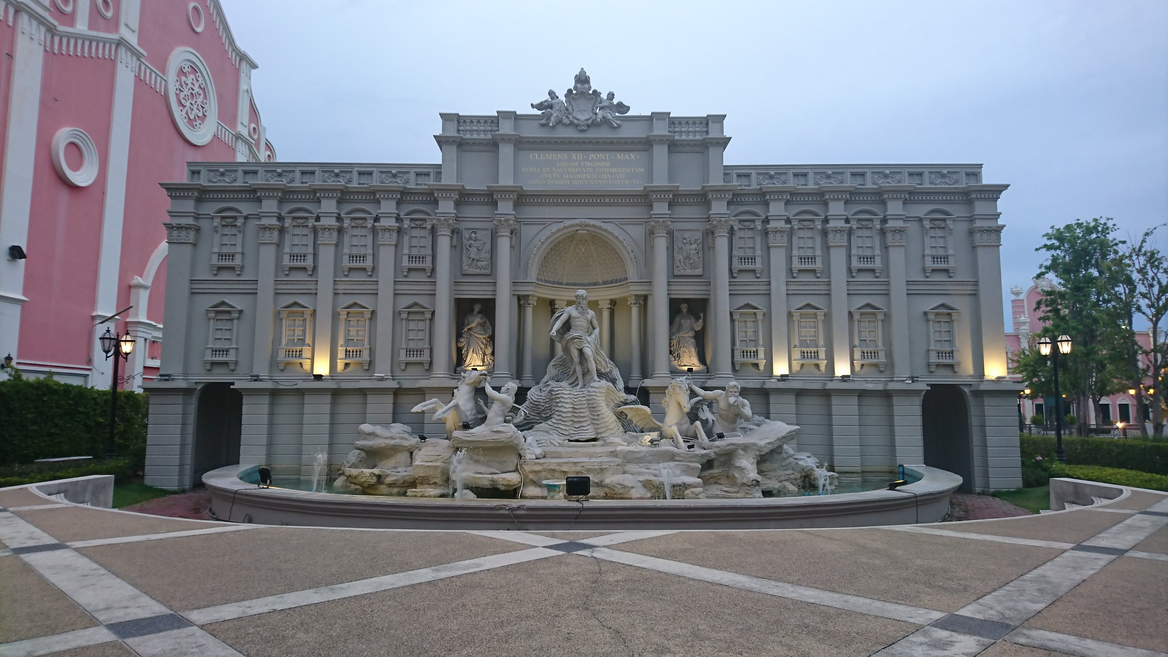 離開小牧場後,附近就是歐式公園,一座矮矮的粉紅色建築物一下子就映入眼簾,別以為這不過是個普通的小花園,但裡面處處驚喜,簡直滿足了大家的少女心。從入口的白鐵枝拱門,到裡面的雕像、擺設,處處流露著浪漫。一進去便能看到個小型的許願池,再後面是白色的鐵枝勾勒出的南瓜車,坐上去人人都能成為灰姑娘。另一面是個大型的羅馬許願池,池中間是一堆雕像,呈現著這個壯士與飛馬搏鬥的場面,中間的男人披著的披肩長長的又似是化成水般。也許是關於水,這讓我想起了希臘神話裡的海神波塞頓(儘管這裡是小威尼斯)。不管是後面的建築還是前面的雕塑、許願池都充滿了歐式情懷,這超好拍!