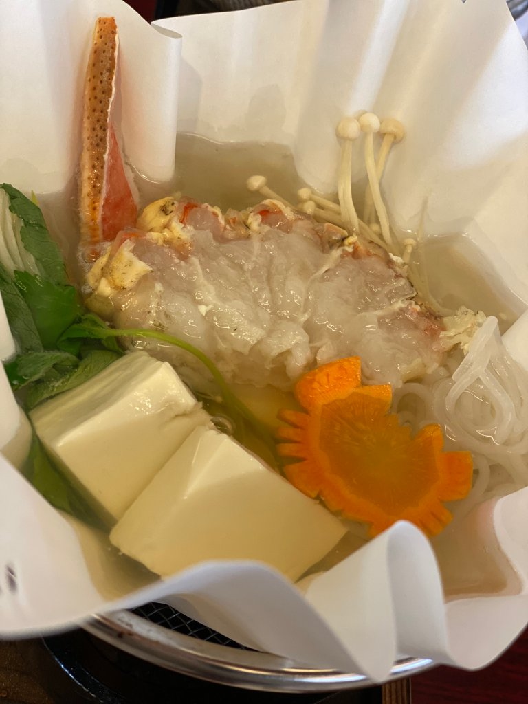 - 螃蟹壽喜小鍋(湯底很清淡,但蟹肉都很夠味。可愛的是紅蘿蔔切成了螃蟹的形狀~)