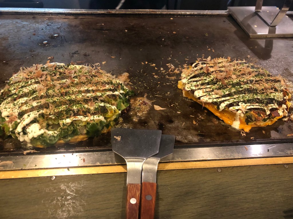 鮮蝦、紫蘇、起司御好燒(エビ・シソ・チーズ,¥1,360):餐牌上寫著是很受女生歡迎的組合,確實我們兩個女生都比較喜歡這一款XDD有芝士的一定不會出錯!唯一出錯的是蝦只有三隻,切四份不好分XDD建議一開始先吃有芝士的,雖然有鐵板一直保溫,但第一塊吃的和最後吃的還是差太遠了TTTT