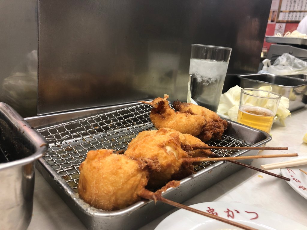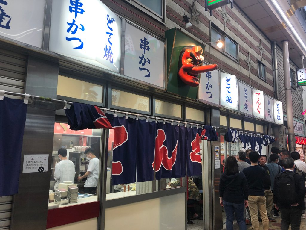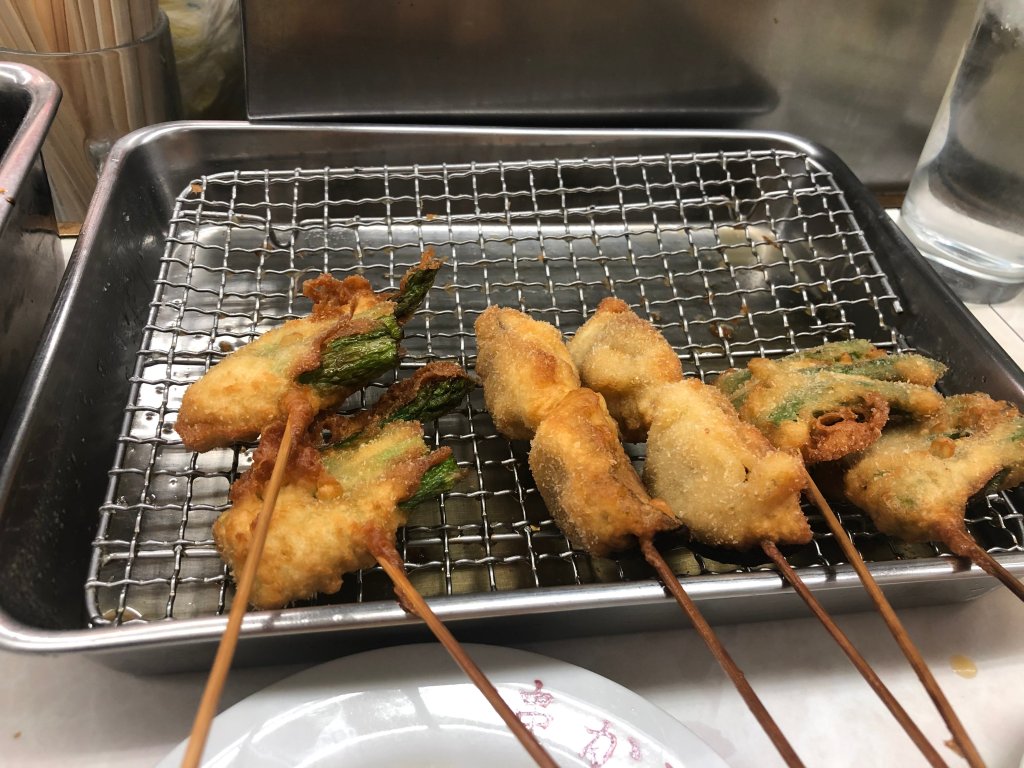 新世界通天閣附近一帶是串炸的出生地(?),超多串炸店~這次我們去吃了大阪人Tommy Tommy都推介的天狗串炸~店的旁邊就是在觀光客當中超有名的八重勝串炸XDD當天我們大概四點多來到天狗,天狗裡面剛好有兩個空位,旁邊八重勝裡已經排起隊來了!超多人!