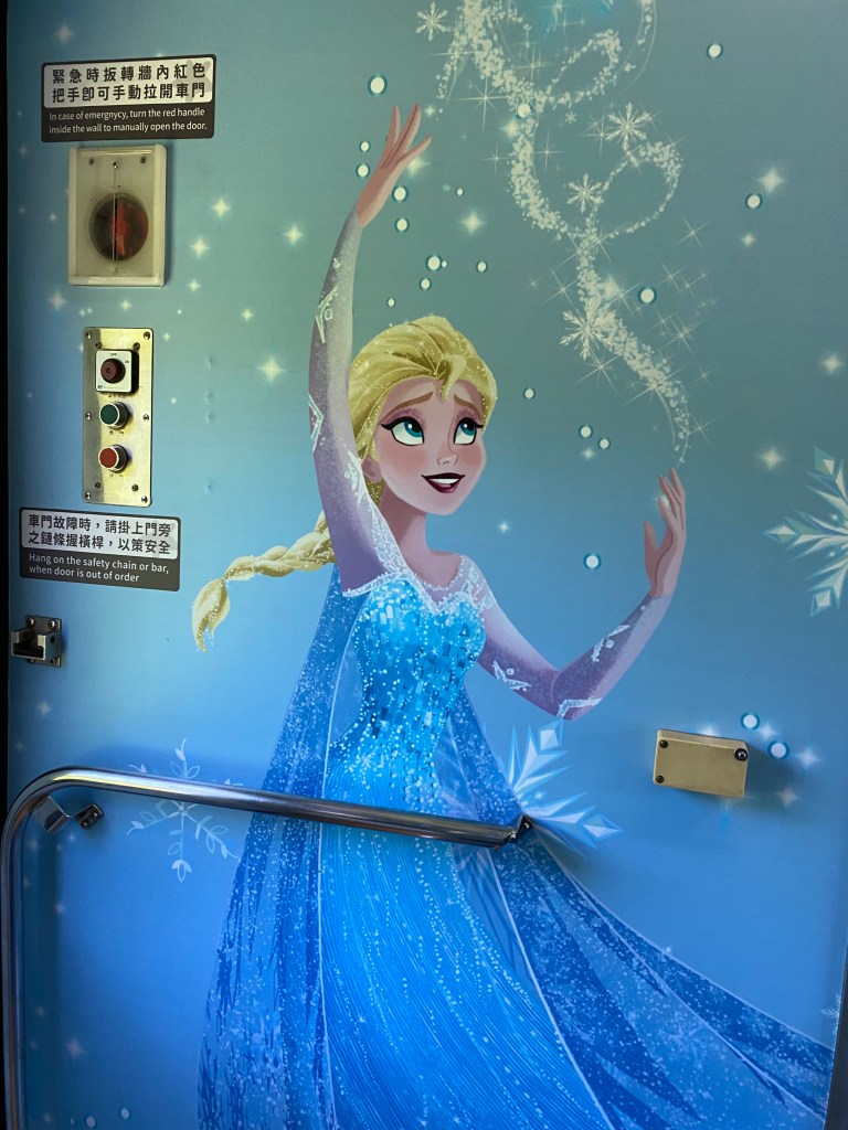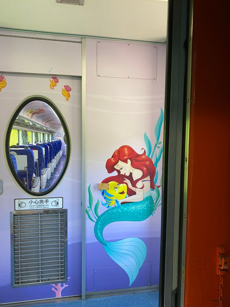 火車車廂外觀也有彩繪,有冰雪奇緣(重覆了兩次)、美人魚、睡公主、灰姑娘、茉莉、貝兒(公主們)、小飛象、米奇、米妮(ummm好像跟YouTube上看到的不太一樣,沒能看到反派們)